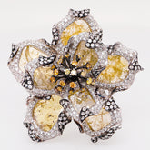 Creating a piece like this requires a delicate balance between design and craftsmanship. Cutting diamonds into thin slices to bring out their natural inclusions is indeed the biggest challenge to this piece, and requires expertise and skill. Our artisans have painstakingly set each diamond to ensure that the ring not only looks stunning but also feels comfortable to wear. The petals are arranged in a way that mimics the natural symmetry of a flower, while the embellishments are strategically placed to enhance the overall brilliance of the ring. Every detail of this ring has been thoughtfully considered, from the choice of metals to the placement of each diamond. The result is a piece that embodies both timeless elegance and contemporary flair.