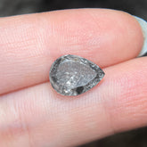 Salt and pepper diamonds are characterized by their inclusions, which give them a distinctive appearance. Unlike traditional diamonds that are valued for their clarity and lack of inclusions, salt and pepper diamonds embrace their flaws. These inclusions, which can range from black carbon spots (pepper) to white minerals (salt), create intriguing patterns and textures within the diamond, making each one truly unique. This 3.79 cts pear shaped diamond is a prime example, featuring mesmerizing galaxy-like inclusions that give it a celestial sparkle.