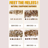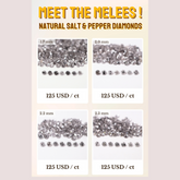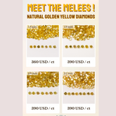 We’re bringing you a handpicked trio of natural colored melee diamonds: Champagne, Salt & Pepper, and Golden Yellow, priced between $125 to $390 per carat, Each parcel requires a minimum purchase of 1 carat