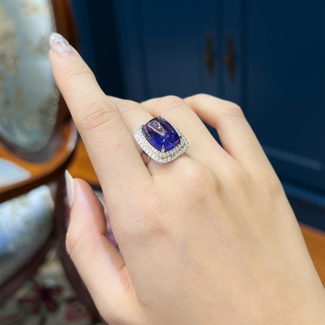 These aren’t just statement rings, they’re conversation starters. Each cabochon catches light differently, giving off a natural, almost mystical glow. Surrounding the tanzanite, brilliant-cut white diamonds bring balance and radiance. Their sparkle enhances the gem’s depth, creating that perfect contrast of fire and calm. Whether you wear it to a dinner, a celebration, or a quiet evening out, these rings does all the talking. And let’s be honest blue-violet looks good on everyone.