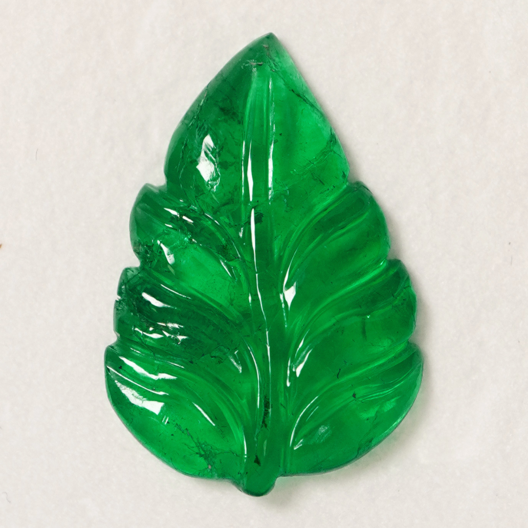This natural Colombian emerald carving shaped into an elegant leaf, weighing 4.59 cts and measuring approximately 19.0 × 13.1 mm. Expertly hand carved rather than faceted, this single piece belongs to our Precious Gems collection and showcases a beautiful, vivid green color that Colombian emeralds are globally admired for. Every ridge and contour has been sculpted with precision, turning the gemstone into a miniature work of art rather than just a cut stone.