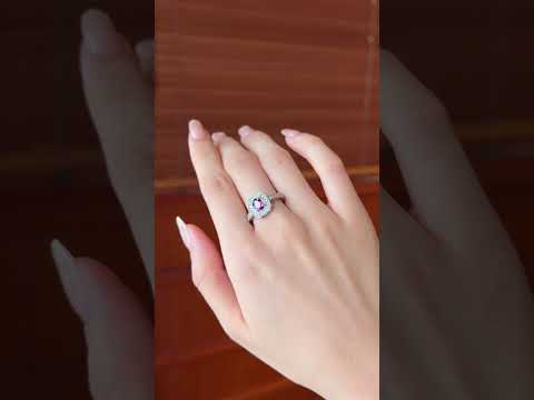Ruby RingVendor: OvalThis elegant ring centers around a vivid oval-cut ruby that radiates with a deep, saturated pinkish-red hue. Surrounded by a geometric halo of round white diamonds arranged in striking triangular and pave-set sections, the design creates a bold interplay of structure and sparkle. The...