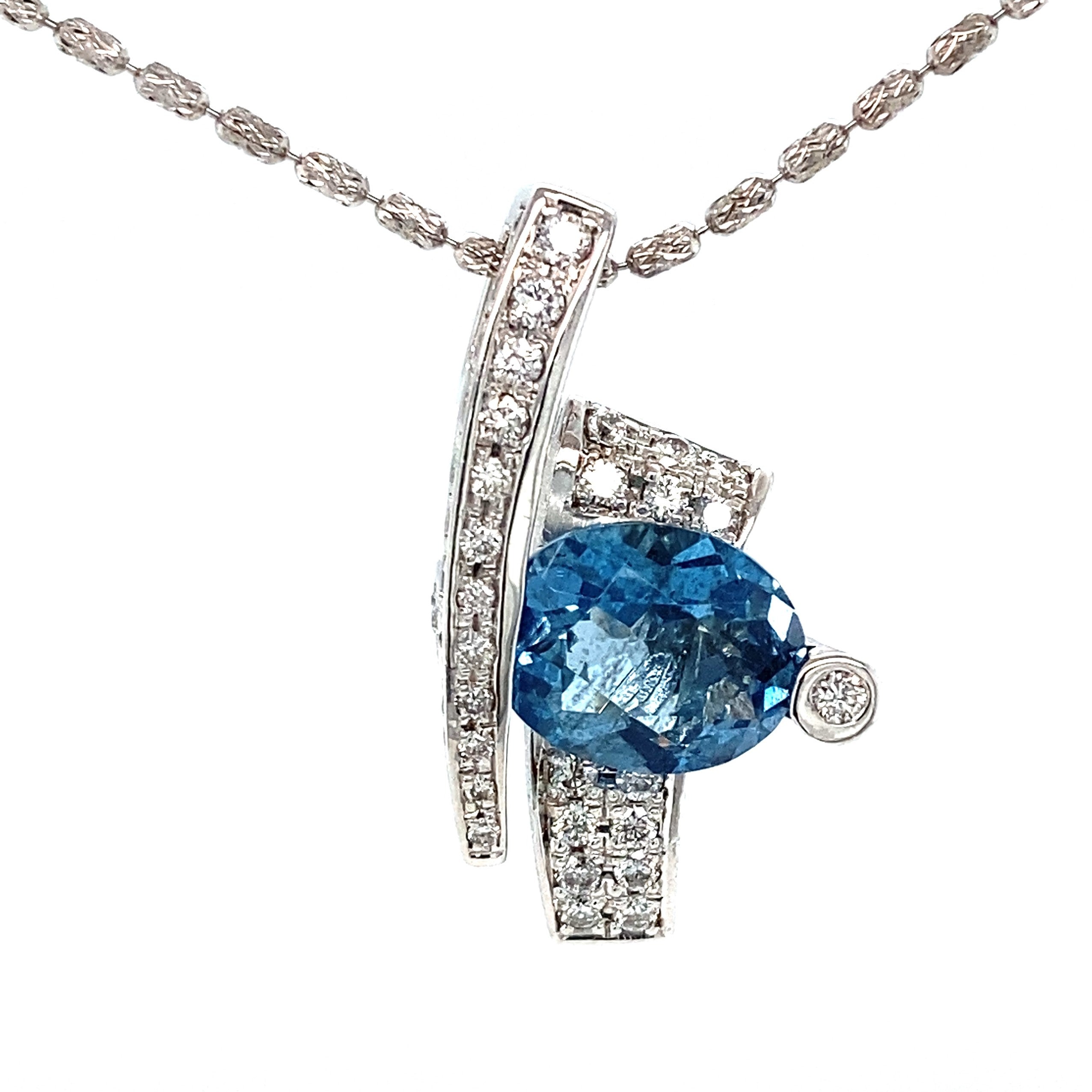 This elegant aquamarine and diamond pendant necklace features a beautiful oval aquamarine displaying a serene ocean-blue hue. The gemstone is framed by flowing lines of sparkling white diamonds, creating a graceful and modern design that enhances its brilliance. Refined and timeless, this natural aquamarine diamond pendant is perfect for everyday elegance or special occasions.