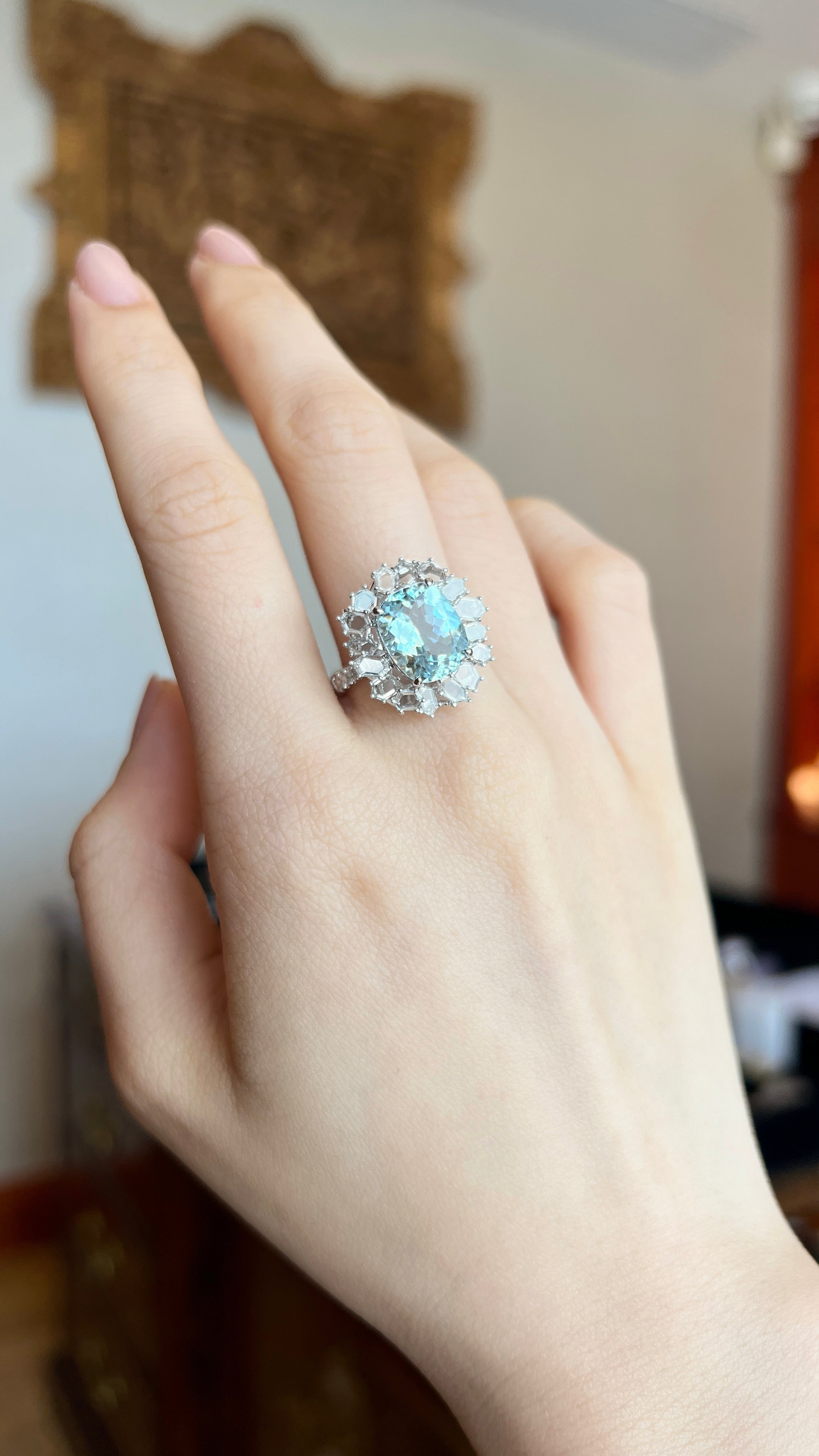 Cool, calming, and effortlessly luxurious—this handcrafted 18K white gold Aquamarine Ring is designed to shine with quiet sophistication. The cushion-cut aquamarine at the center brings a serene blue glow, while the unique hexagon diamonds and delicate round diamonds add a modern, geometric sparkle that feels both refined and artistic.