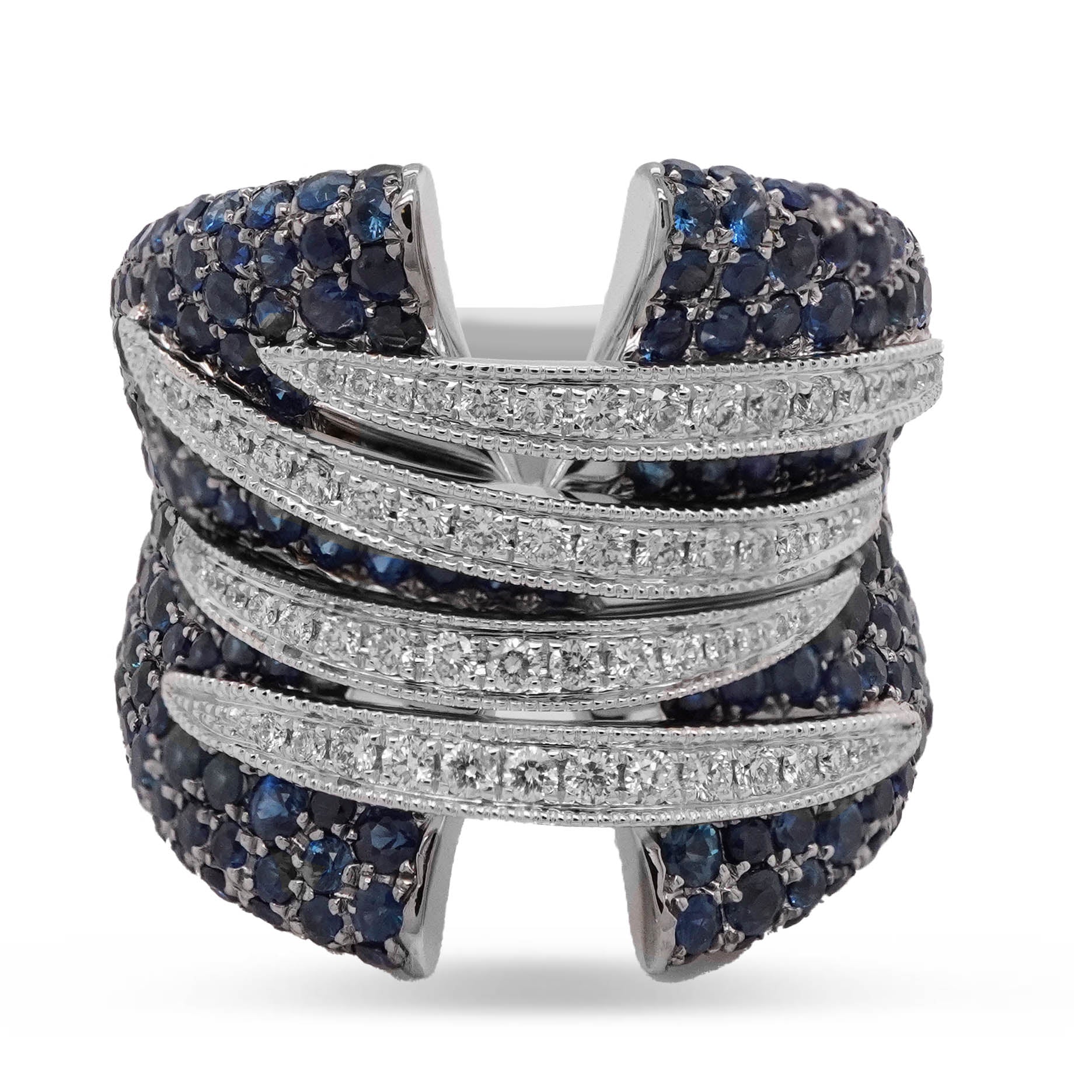 A striking fusion of depth and brilliance, this bold statement ring showcases rich blue sapphires layered with sweeping rows of sparkling white diamonds. The sculptural, wrap-style design creates movement and dimension, blending intense color with radiant shimmer — a powerful piece that feels both modern and timeless.
