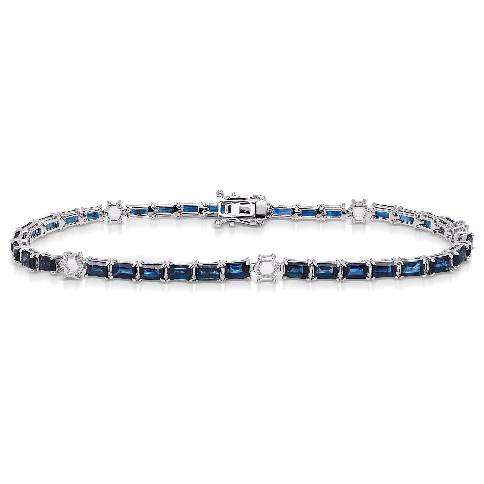 This Blue Sapphire & White Diamond bracelet is a celebration of refined craftsmanship and timeless beauty. Handcrafted in 18K white gold, it brings together geometric precision, vibrant color, and sophisticated sparkle in one seamless design.