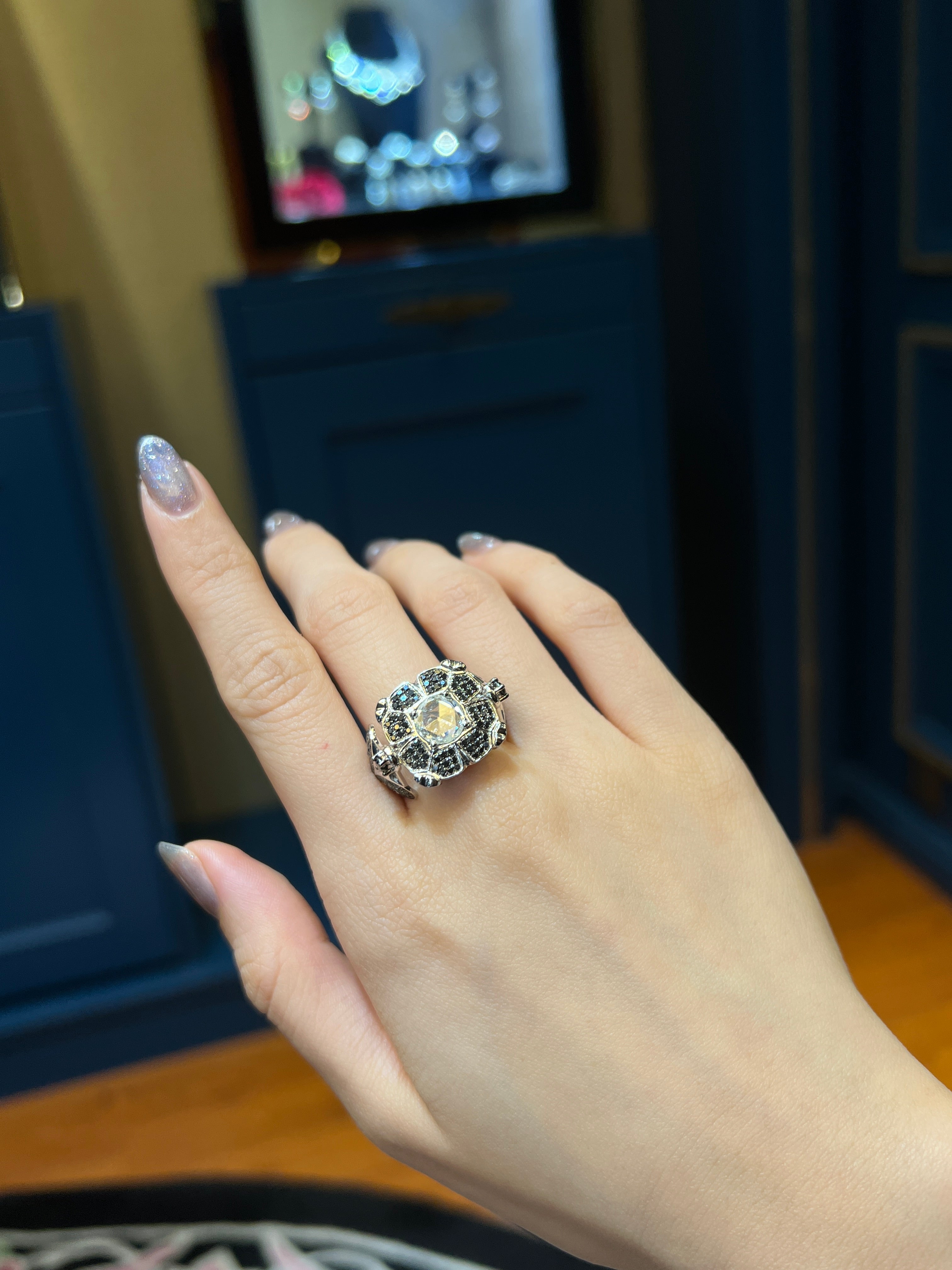 Bold and distinctive, this designer ring features a rose-cut white diamond at its center, radiating a subtle shimmer with natural character and depth. The diamond is encased in a sculptural setting resembling a shield or floral form, completely pavé-set with hundreds of heated black diamonds for a dramatic, high-contrast effect. Additional black diamonds adorn the sides of the band in custom geometric panels, continuing the theme of rich texture and contrast. With its powerful presence and unique silhouette, this ring is a true statement piece for the confident collector.
