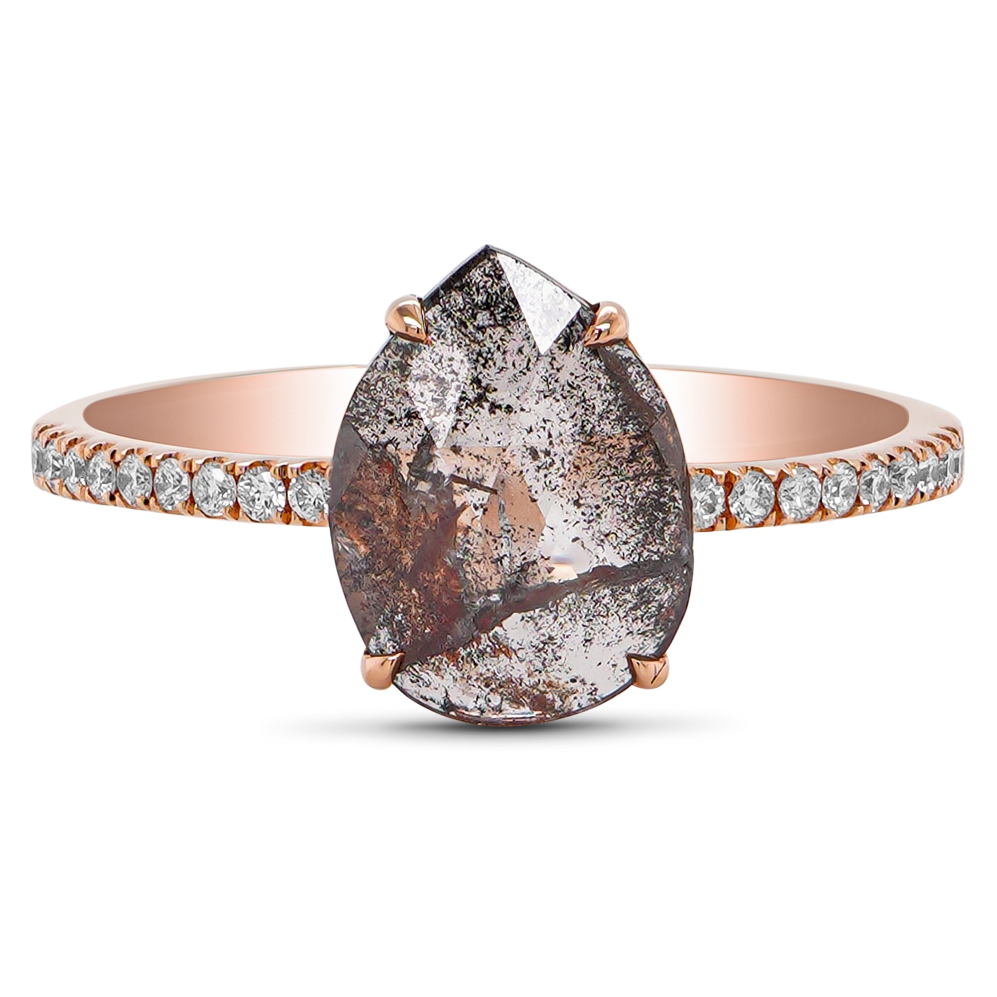 Handcrafted in 18K rose gold, this ring features a striking grey pear-shaped diamond at its center—an icy, mysterious beauty with a modern edge. The cool grey tones pair beautifully with the warm blush of rose gold, creating a contrast that feels both contemporary and timeless. Delicate round white diamonds frame the centerpiece with soft brilliance, adding just the right amount of sparkle without overpowering its natural character.