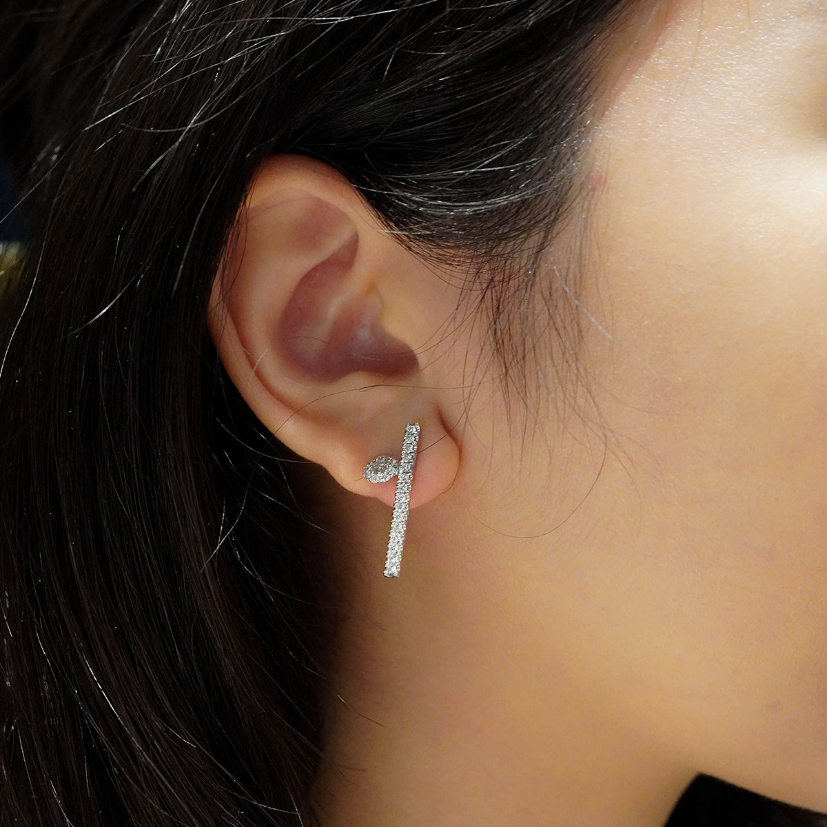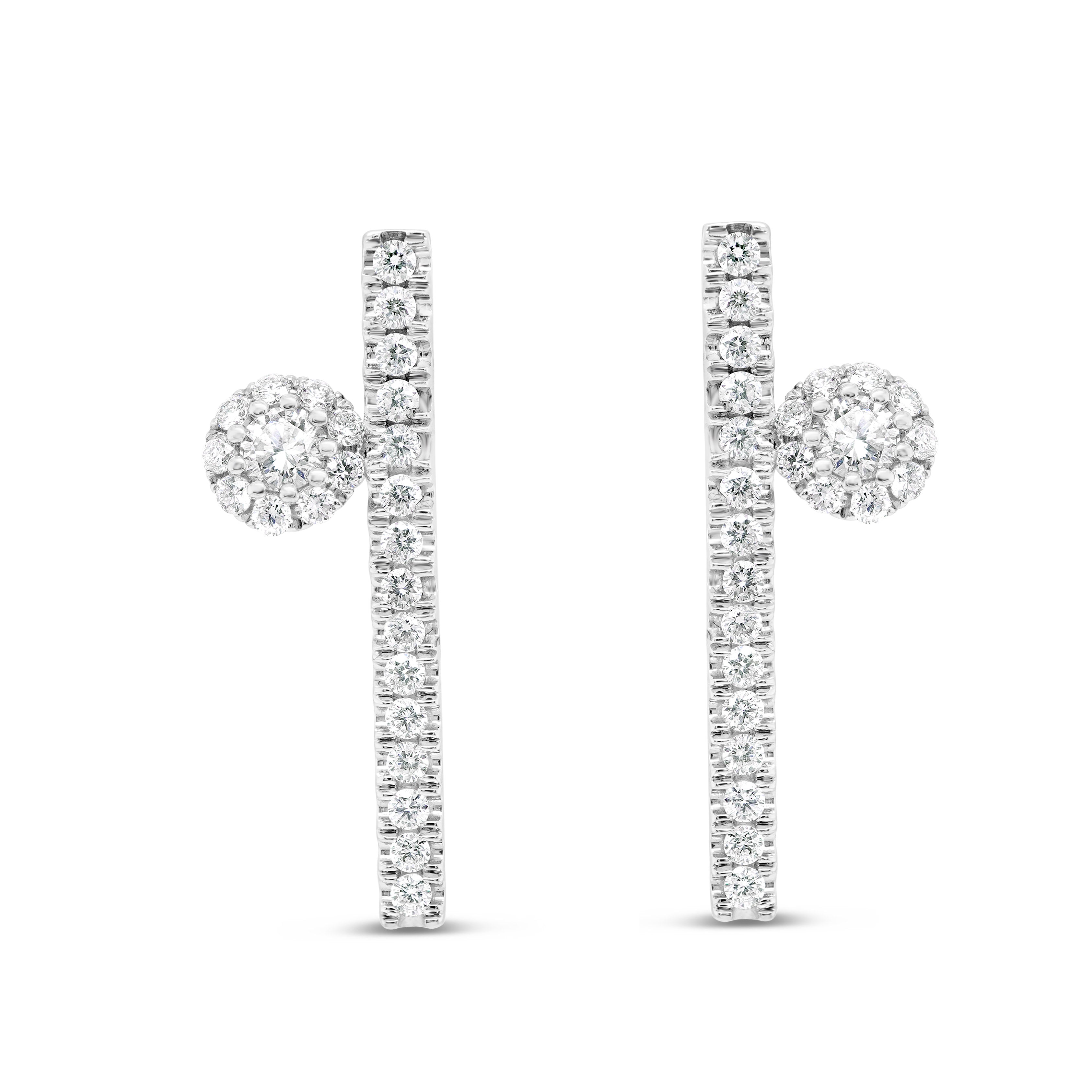 These contemporary earrings juxtapose a vertical line of brilliant white diamonds with a playful pavé sphere — a minimal yet striking design. The linear path adds structure, while the diamond-encrusted globe offers dimensional charm, catching the light from every angle. Perfect for modern sophistication with a touch of cosmic whimsy.
