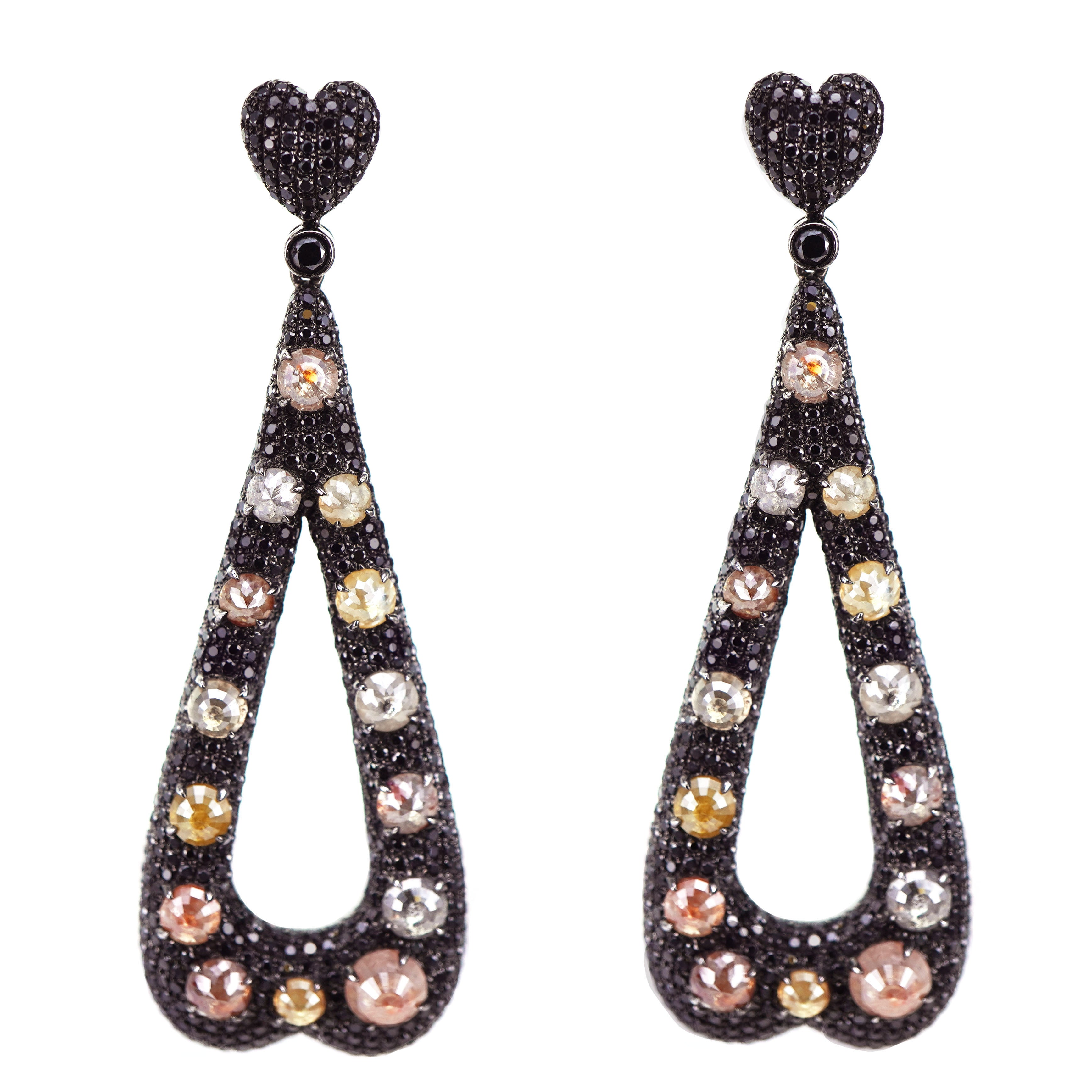 These striking earrings reinterpret the heart motif with an avant-garde twist — sculpted in dramatic blackened gold and ablaze with a constellation of mixed color diamonds. The open teardrop silhouette is boldly punctuated with brilliant round diamonds in hues of champagne, rose, yellow, and icy white, each glowing like stars against a night sky of pavé-set heated black diamonds. At the top, a stylized heart anchors the design, balancing tenderness with bold allure. Romantic yet rebellious, this pair is for the one who writes her own love story in shadows and shimmer.