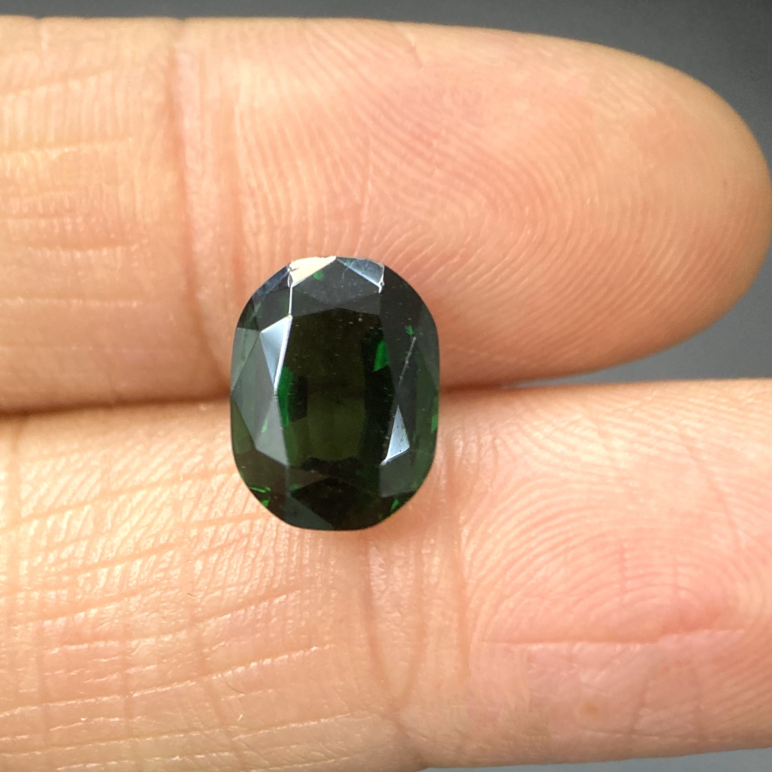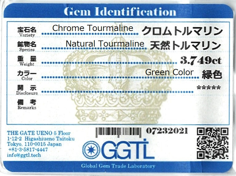 This 3.749-carat chrome tourmaline displays a rich, vivid green color that rivals fine emeralds. Naturally formed with traces of chromium, it shows exceptional brightness and depth. Known for its strong sparkle and rarity, this gemstone is perfect for statement rings, pendants, or high-end jewelry creations. A bold and beautiful choice for those who love vibrant green gems.