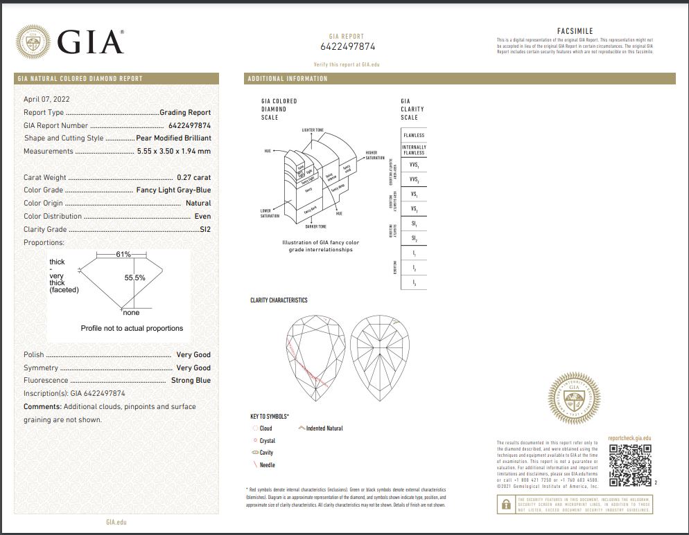 This diamond is truly rare, blue diamonds are some of the hardest colors to find in nature. It shows a soft grayish-blue shade that feels calm and elegant. Weighing 0.27 carats, it shines beautifully and can be used for a custom ring, pendant, or other fine jewelry. A small gem with a rare and special color.