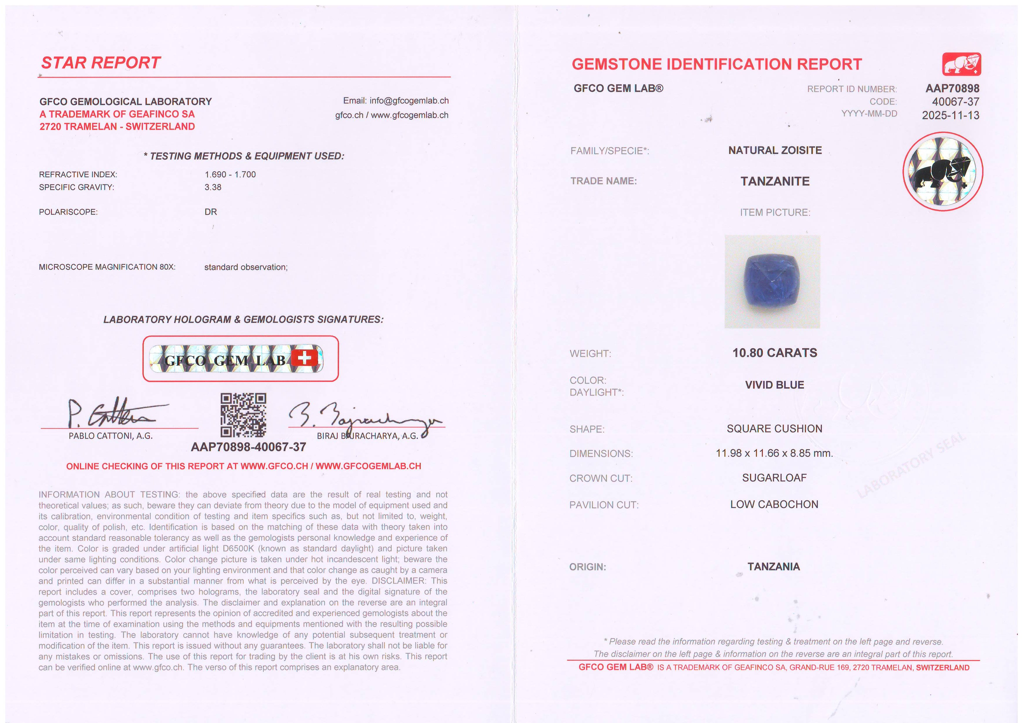 Natural Tanzanite (10.80 Cts) showcases the captivating deep blue color that makes this gemstone so admired. Cut in a smooth Sugar Loaf cushion shape, this gem highlights Tanzanite’s natural richness and elegant glow. Sourced from Tanzania, the only place in the world where Tanzanite is found, this 10.80-carat gemstone stands out for its impressive size and beautiful color, making it an exceptional choice for collectors or for creating a striking custom jewelry piece.
