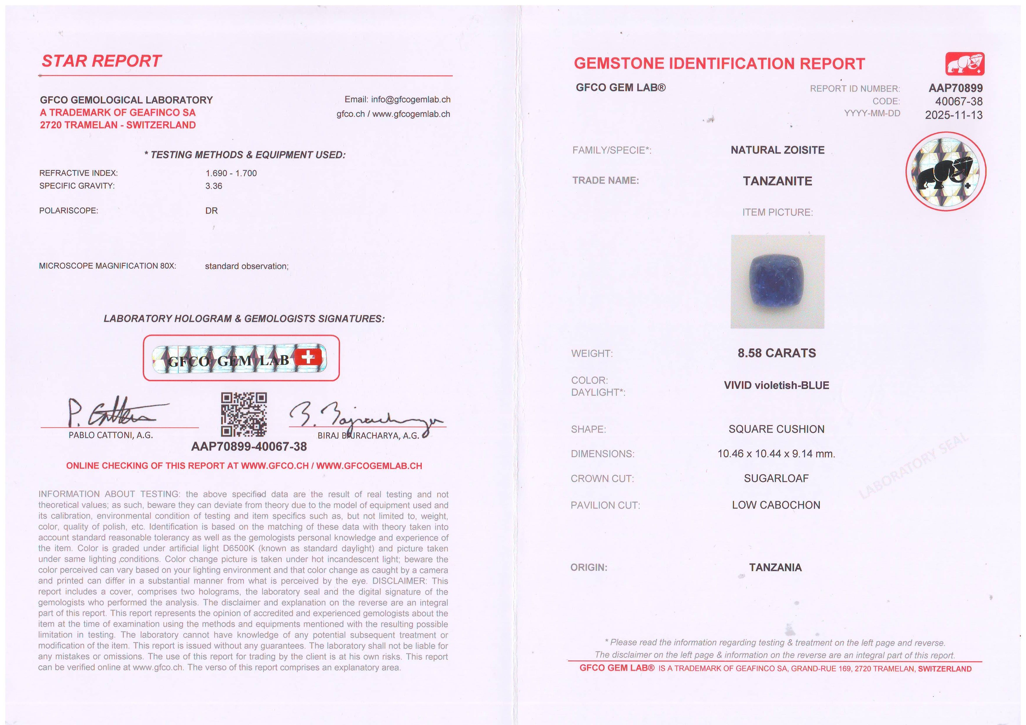 Natural Tanzanite (8.58 Cts) showcases the captivating deep blue color that makes this gemstone so admired. Cut in a smooth Sugar Loaf cushion shape, this gem highlights Tanzanite’s natural richness and elegant glow. Sourced from Tanzania, the only place in the world where Tanzanite is found, this gemstone stands out for its impressive size and beautiful color, making it an exceptional choice for collectors or for creating a striking custom jewelry piece.