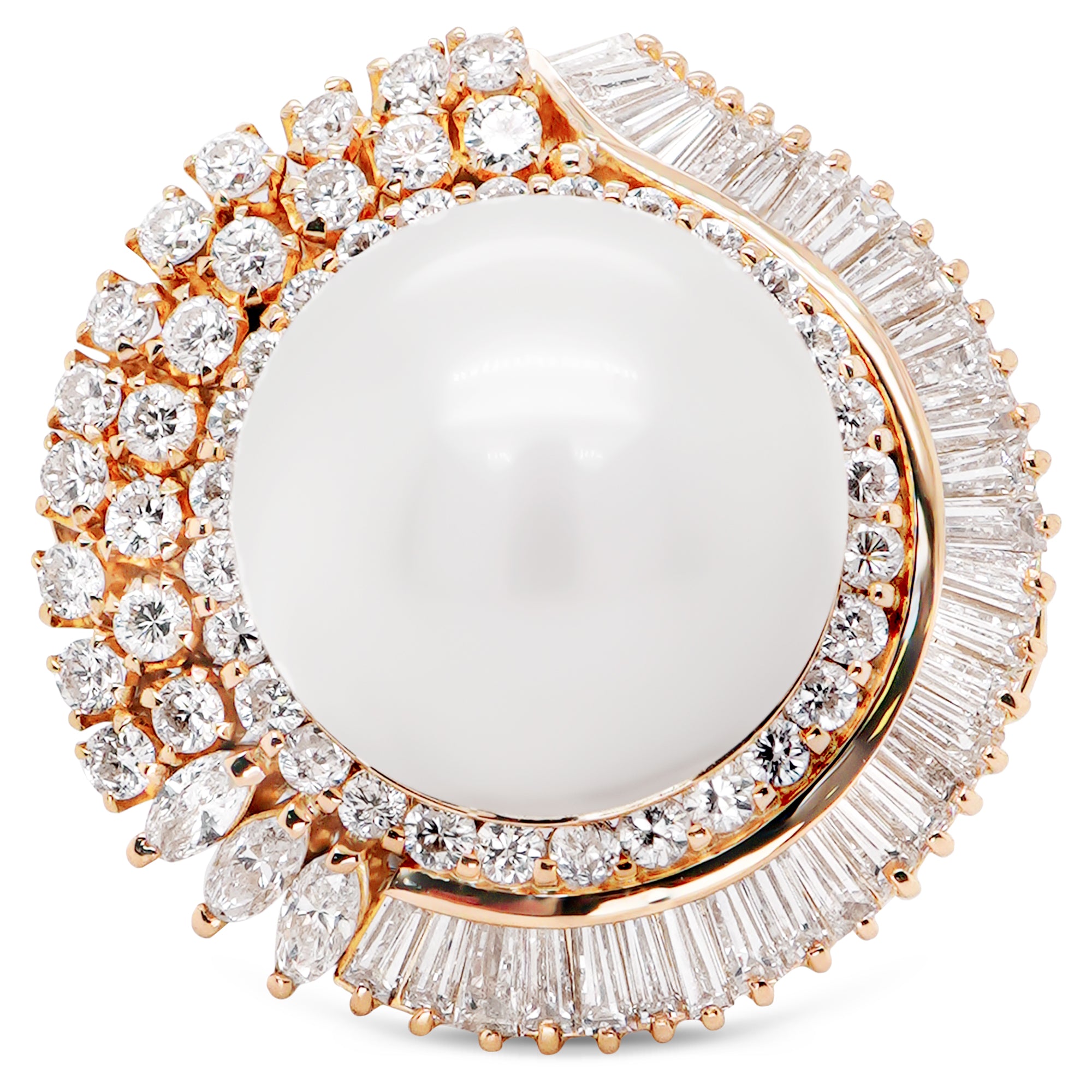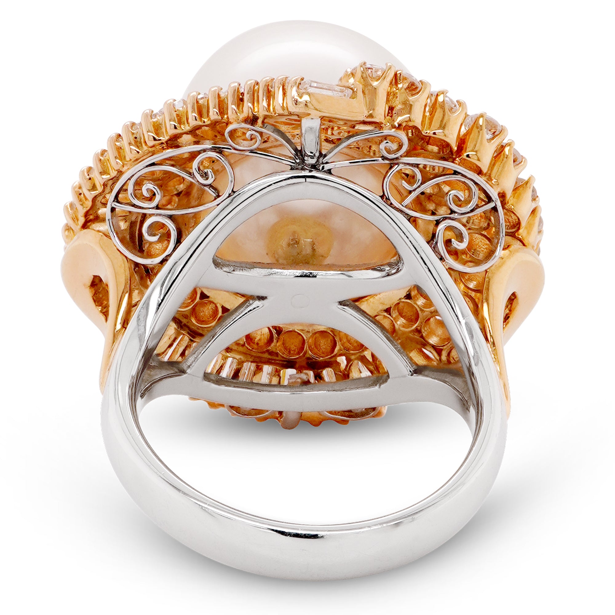 An exquisite blend of elegance and brilliance, this handcrafted ring combines the timeless beauty of a large, luminous white pearl with a stunning array of mixed-shaped diamonds. Crafted in a sophisticated mix of 18K white, yellow gold, and platinum, the design showcases a harmonious balance of softness and sparkle.