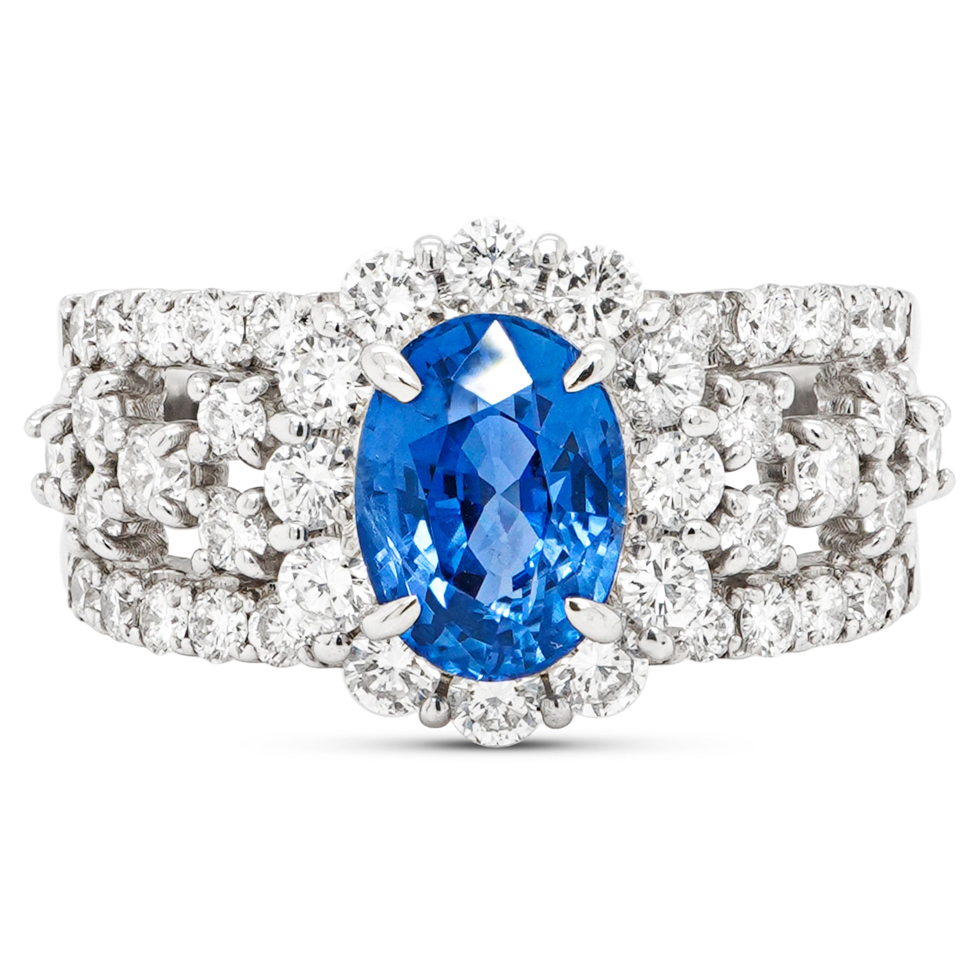 Handcrafted in PT900 White Platinum, this exquisite ring features a rare No Heat Burma Sapphire with a brilliant oval cut, showcasing its deep, captivating blue. Accented by sparkling round white diamonds, this piece combines timeless elegance with exceptional craftsmanship.
