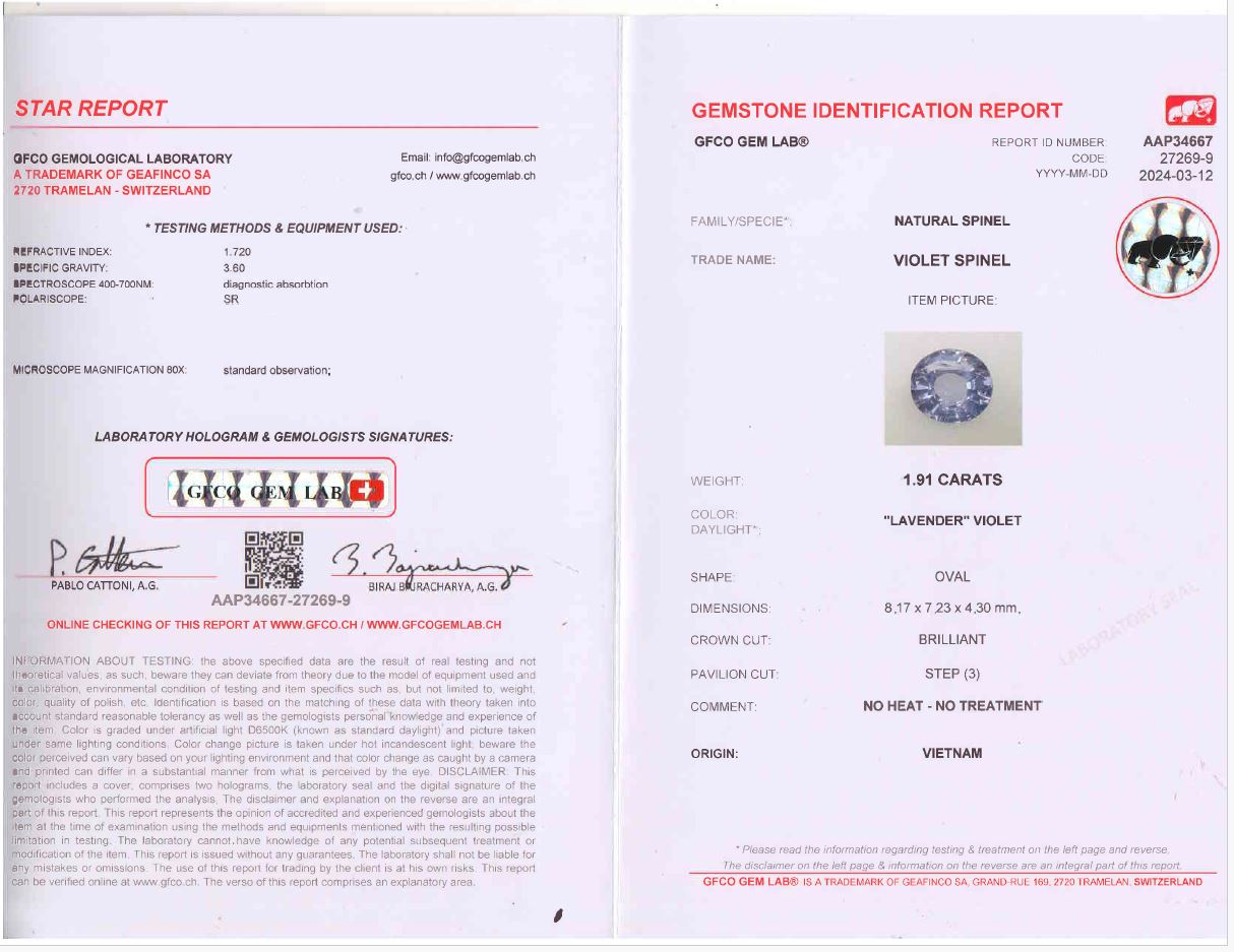This 1.91-carat lavender spinel is special for its naturally soft violet hue and complete lack of heat treatment — a sign of pure, untouched beauty. The gentle lavender color gives it a calm and elegant look, while its natural brilliance adds a graceful sparkle. Spinels of this color and clarity are quite rare, making it a perfect choice for collectors or for creating refined rings and pendants. Ideal for special occasions, this gem brings a soothing charm to any jewelry design.