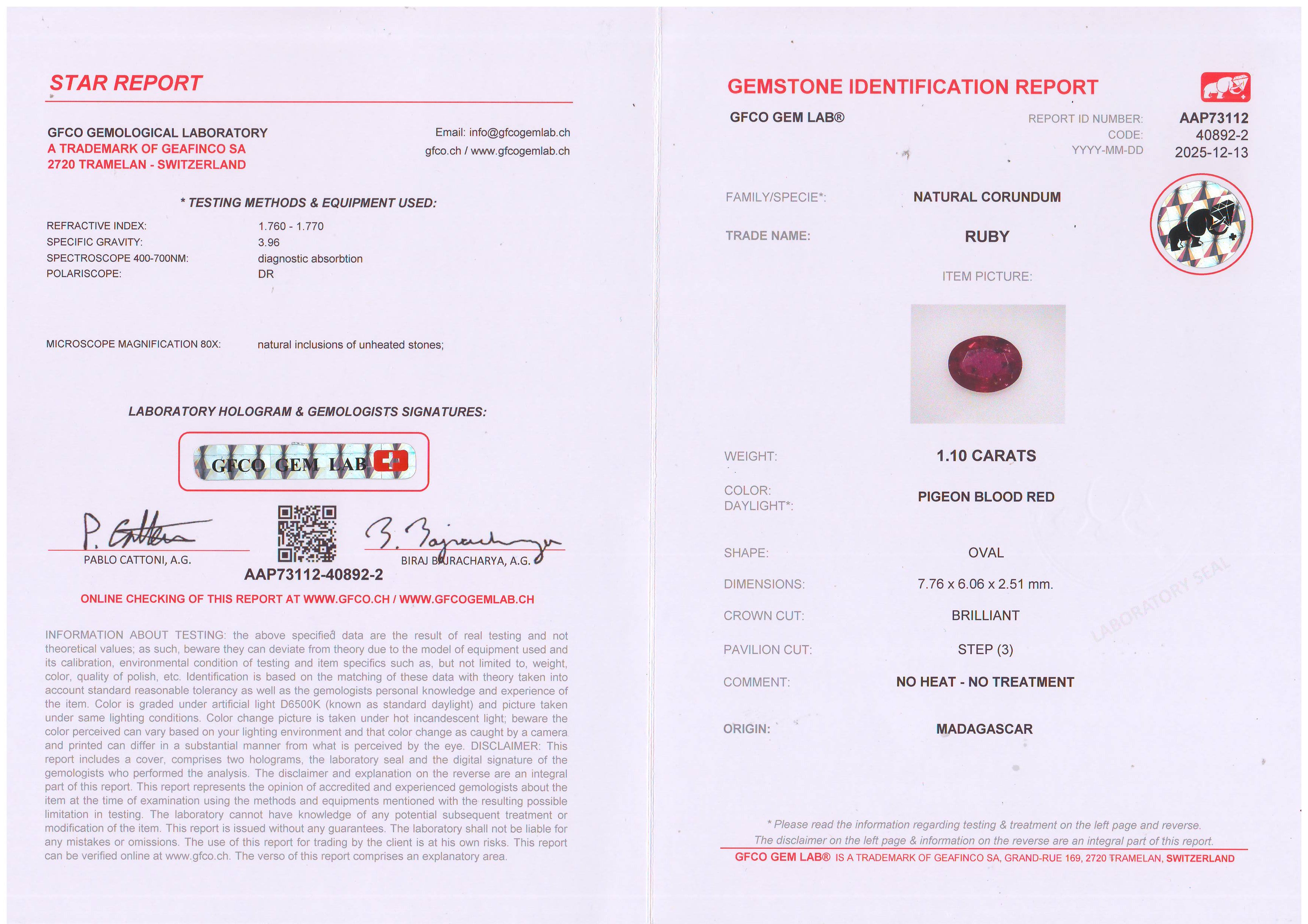 This 1.10-carat No Heat Pigeon Blood Red Ruby represents the absolute pinnacle of gemstone quality, showcasing the most legendary and sought-after color in the world of rubies. The "Pigeon Blood" designation is reserved only for stones with this specific, high-intensity red glow that remains vivid under any lighting. Because this ruby is completely unheated, its rich saturation is a pure gift from nature, making it a rare find for those who only collect the finest natural treasures. Adding this piece to a collection is important because it serves as a gold standard for quality and rarity; it is a unique investment that captures both timeless beauty and significant market prestige. Owning a stone of this caliber means possessing one of nature's most extraordinary creations, ensuring your collection is truly world-class.