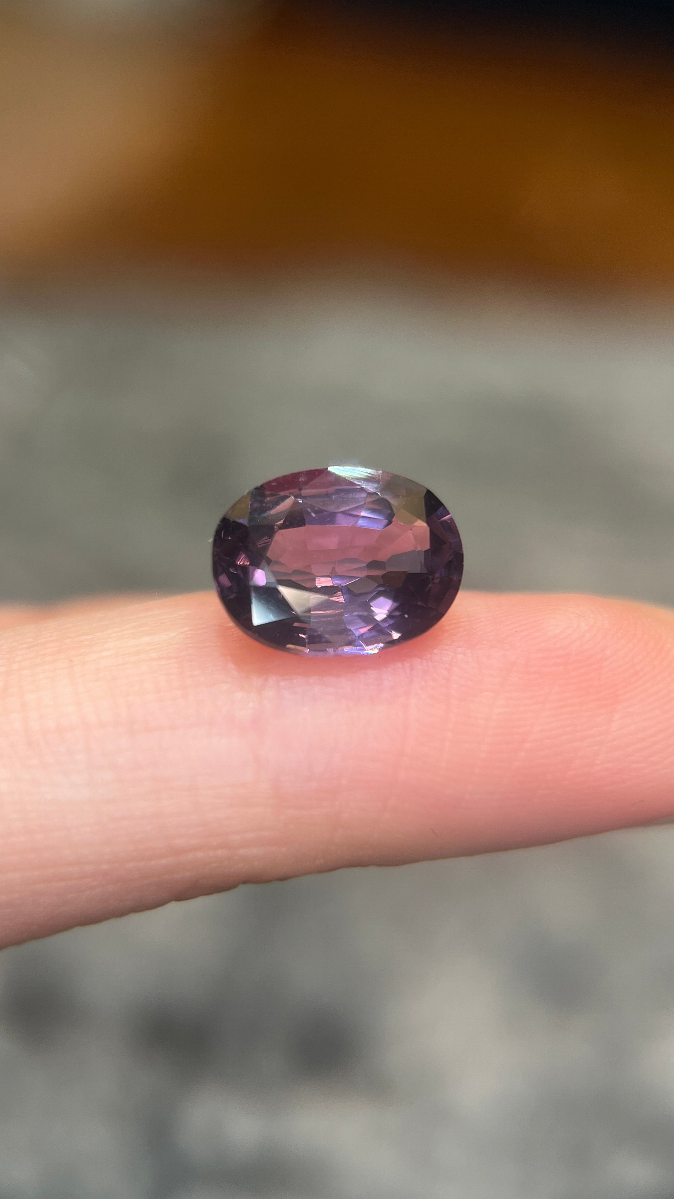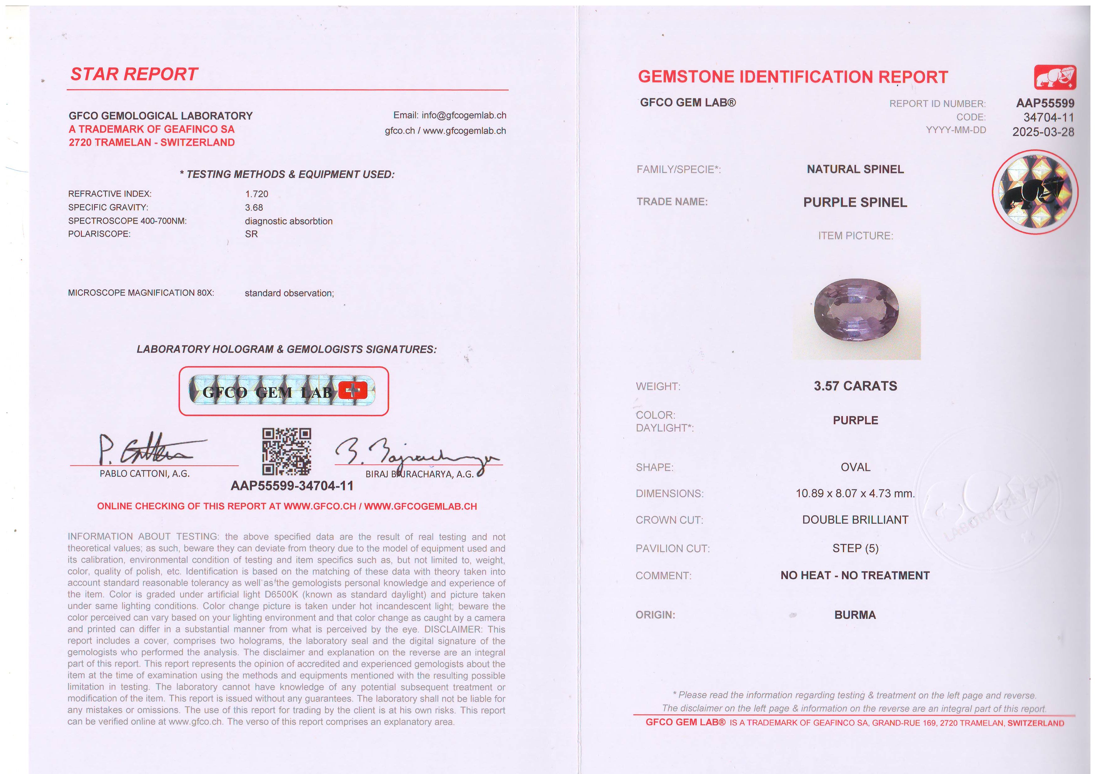 A natural beauty from Burma, this 3.57-carat spinel shows a rich purple hue with no heat treatment , completely natural. Burmese spinels are highly prized for their vivid color and clarity, and this gem is no exception. Its deep, royal tone and fine luster make it perfect for an elegant ring or pendant. A rare and timeless gemstone for collectors and jewelry lovers alike.