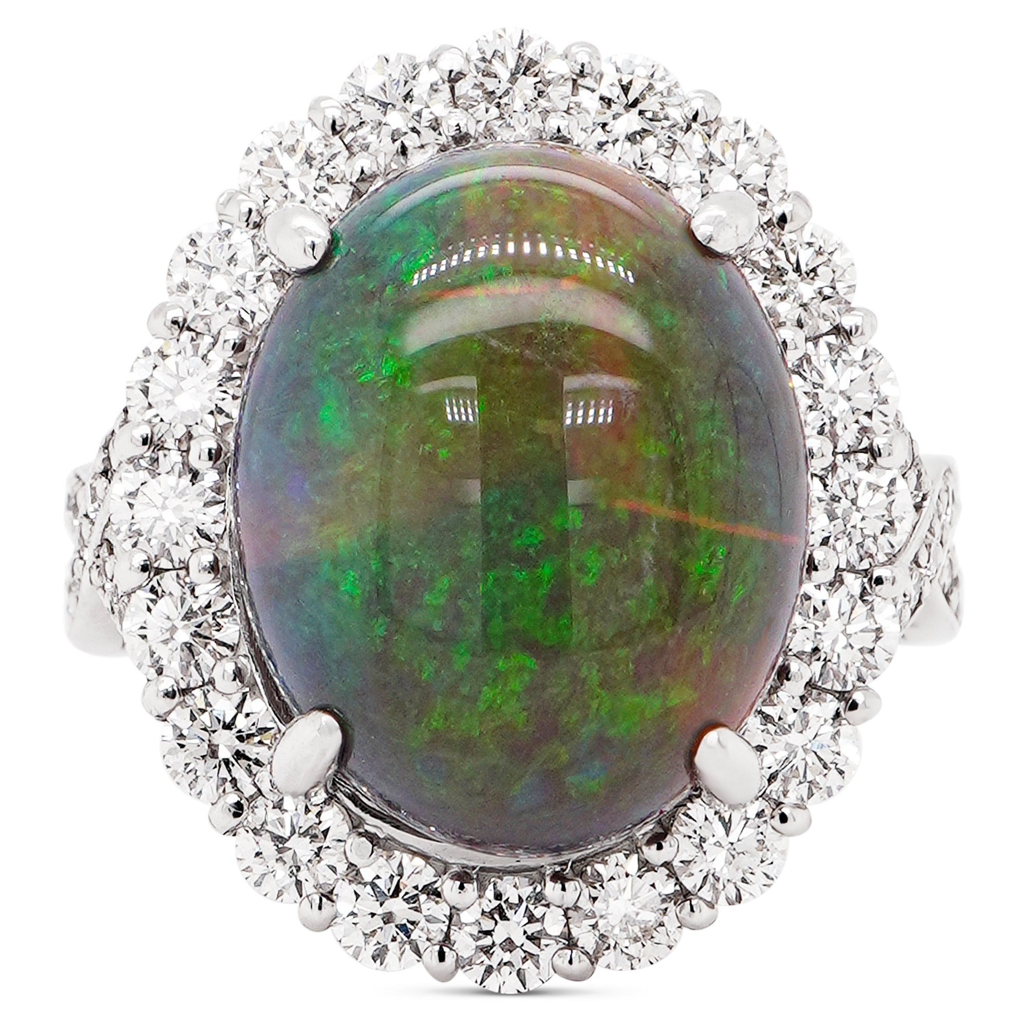 Handcrafted with PT900 Platinum, this striking ring showcases a mesmerizing black opal cabochon weighing over 11 carats. Its rich play of color and smooth oval shape create a captivating centerpiece, beautifully complemented by 46 brilliant round white diamonds that add sparkle and sophistication.