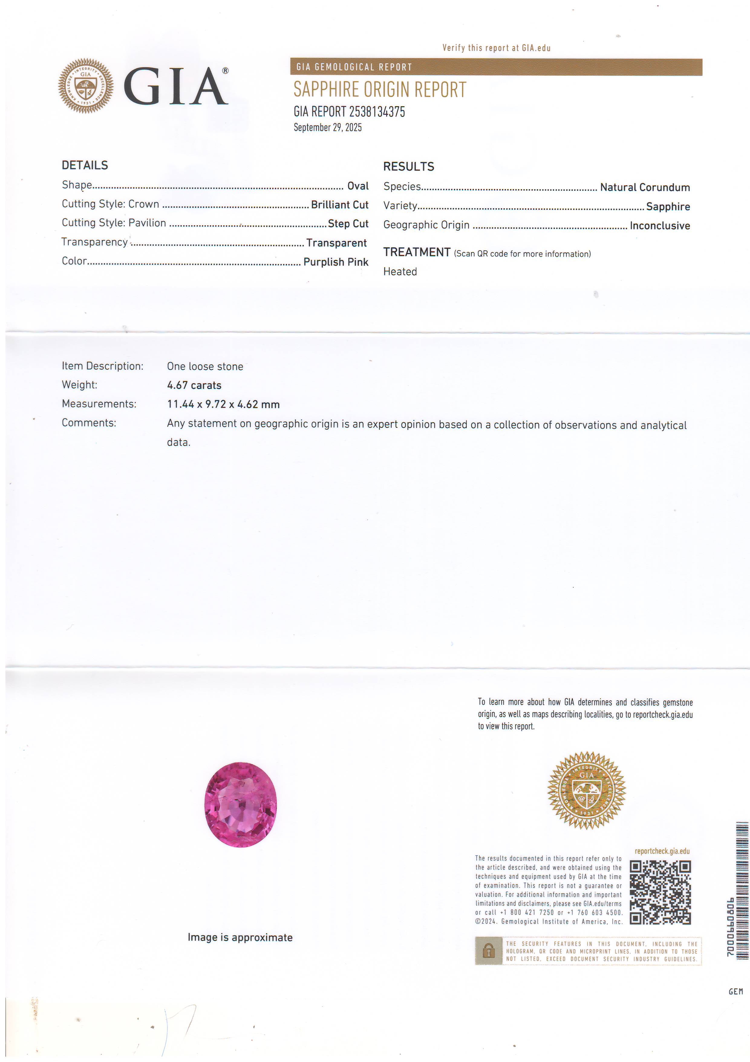 Elevate your collection with the undeniable magnetism of this 4.67-carat Purplish Pink Sapphire, a gemstone that defines the pinnacle of vivid natural color. While most sapphires lean toward the subtle, this extraordinary specimen radiates an intense, "neon" fuchsia glow, masterfully tempered by sophisticated violet undertones that lend it a regal, multidimensional depth. Its substantial size—nearly five carats—is a rarity in the world of fine gems, making it a prestigious anchor for a bespoke heirloom or a high-jewelry statement piece. This sapphire isn't just a choice; it is a captivating fusion of rare geological artistry and luminous energy, perfect for the visionary who wants their jewelry to reflect a bold, brilliant, and entirely unique spirit.