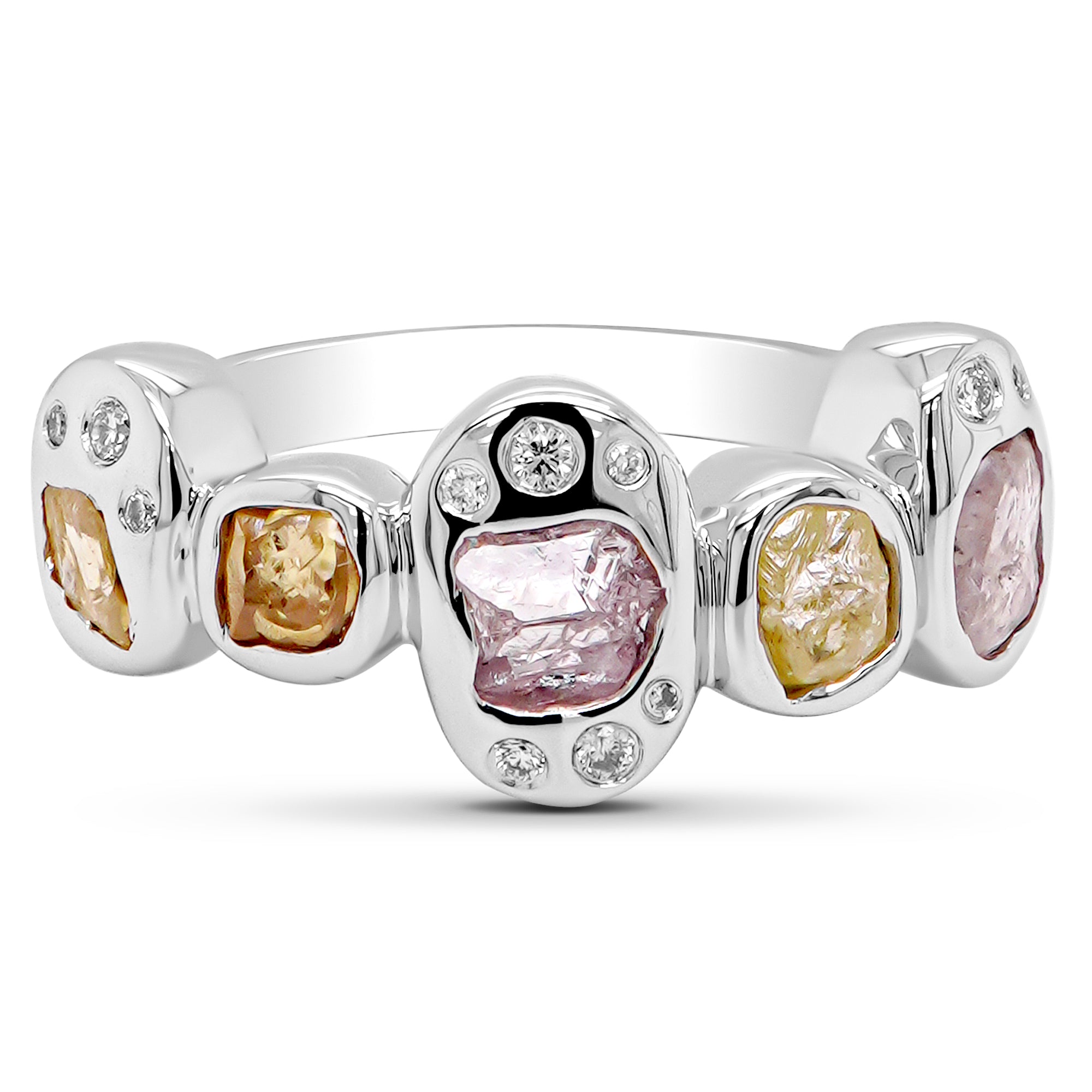 Bold, organic, and full of character—this handcrafted 18K white gold ring features a cluster of raw diamonds in their natural free-form shapes. Each uncut diamond carries its own texture and personality, giving the ring an earthy, one-of-a-kind charm you won’t find in traditional cuts. A touch of brilliant white diamonds adds a hint of sparkle, balancing the rustic beauty with refined elegance.