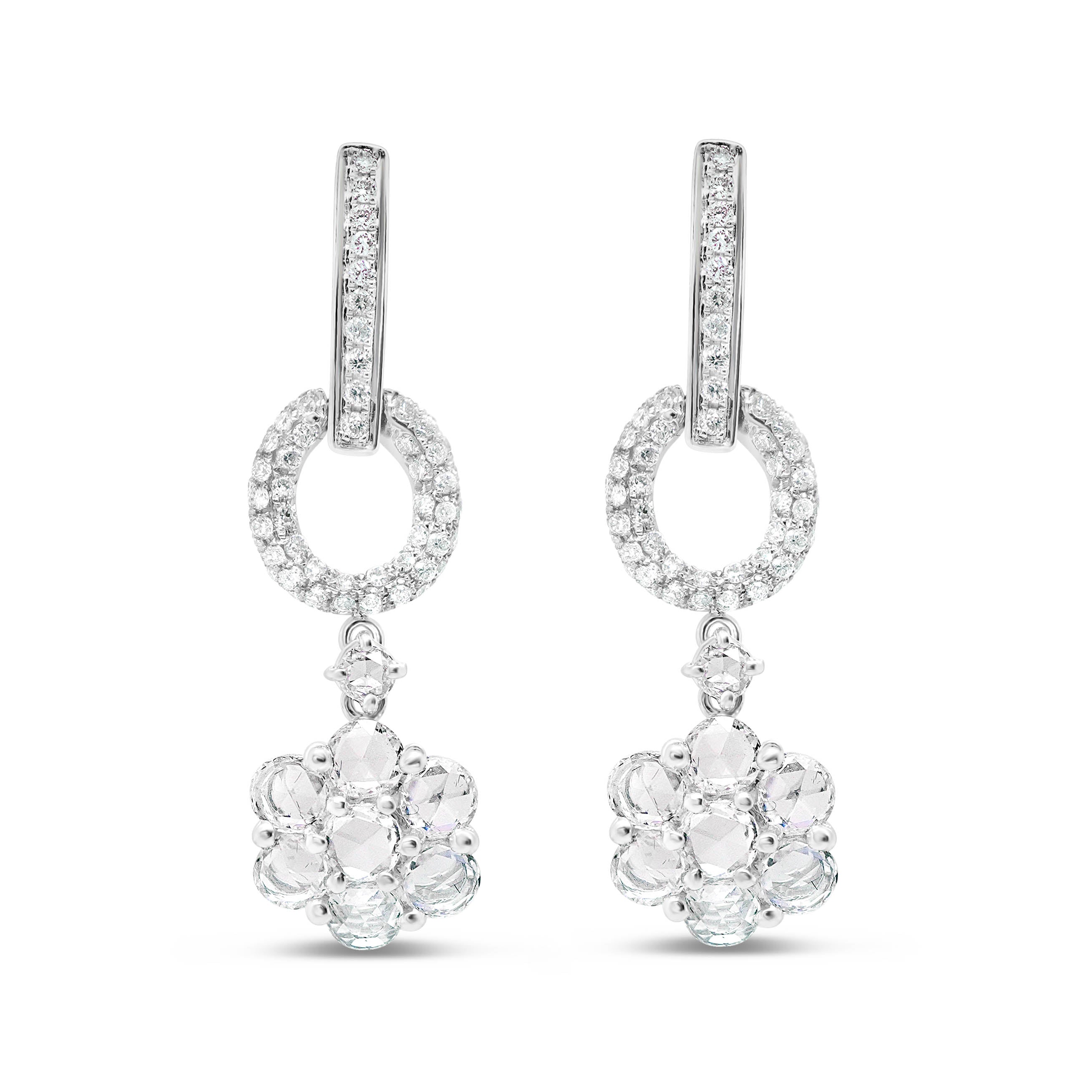 A poetic ode to symmetry and shimmer, these earrings feature a snowflake-inspired floral motif crafted from rose-cut diamonds, each petal catching light with a soft vintage glow. Suspended from twin halos of pavé-set brilliant-cut diamonds, the design offers layers of radiance — from the crisp sparkle of modern brilliants to the romantic gleam of rose cuts. The composition balances delicacy and opulence, with an airy elegance that moves gracefully with every step. A timeless choice for those who appreciate intricate detailing and ethereal charm.
