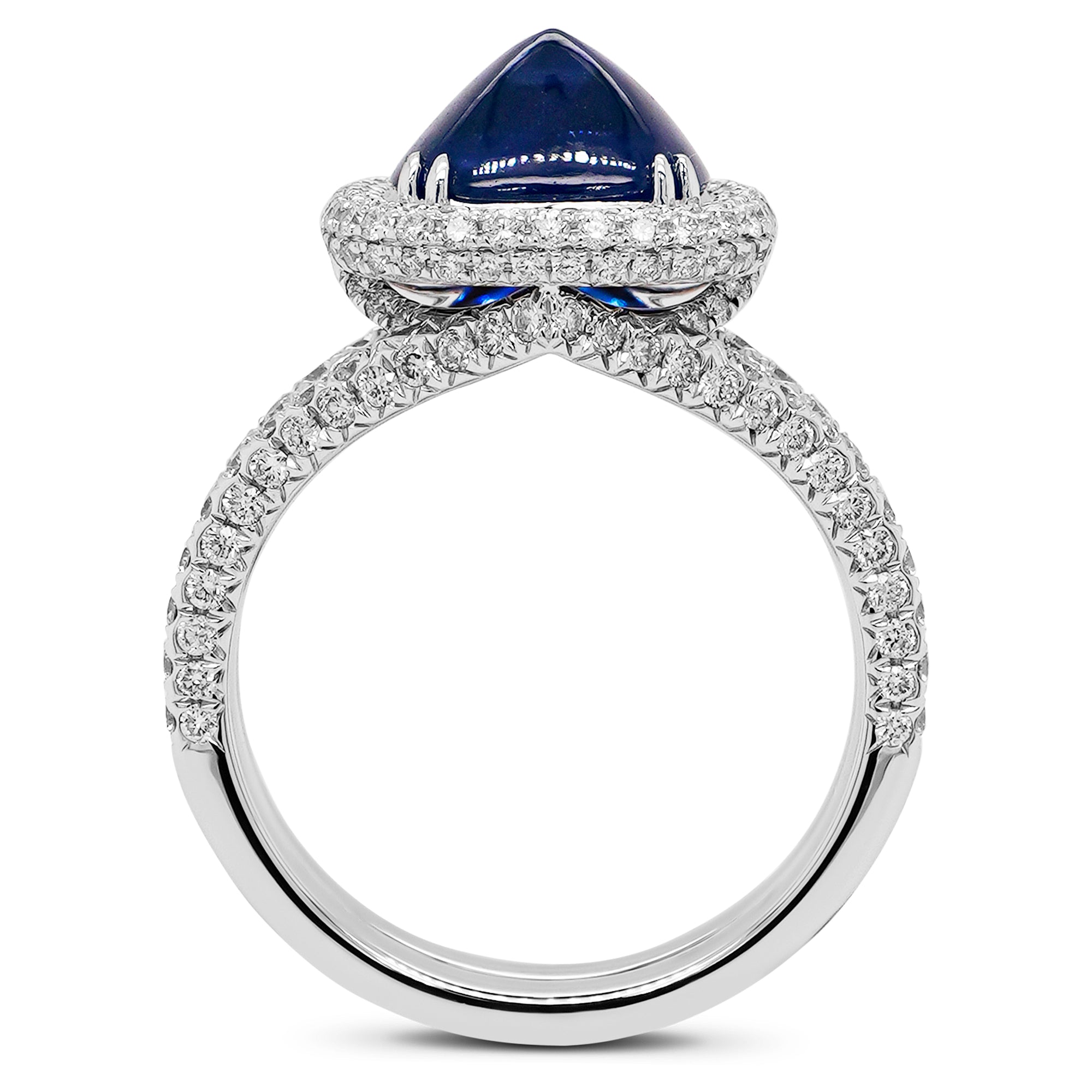 Bold, smooth, and irresistibly elegant — this ring showcases the magic of a true Ceylon Royal Blue Sapphire in a rare Sugar Loaf cut. Unlike traditional faceted sapphires, the Sugar Loaf style features a polished, domed surface that makes the royal blue glow deeper, richer, and more luxurious. It’s a cut admired by collectors for its softness, volume, and the way it captures light without harsh reflections.