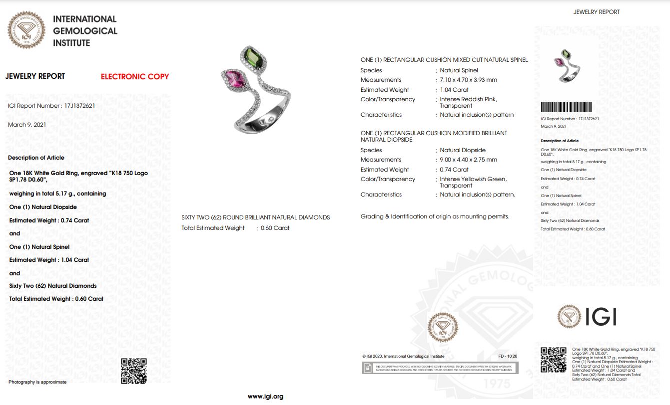 This striking Burma spinel and diamond ring features two vibrant natural spinels set in a bold and contemporary design. One spinel displays a vivid pink hue, while the other showcases a captivating green tone, creating a beautiful contrast of color. Surrounded by sparkling brilliant white diamonds, the design highlights the rarity and brilliance of these exceptional gemstones. Elegant and distinctive, this natural spinel diamond ring is perfect for collectors of rare gemstones and modern fine jewelry.