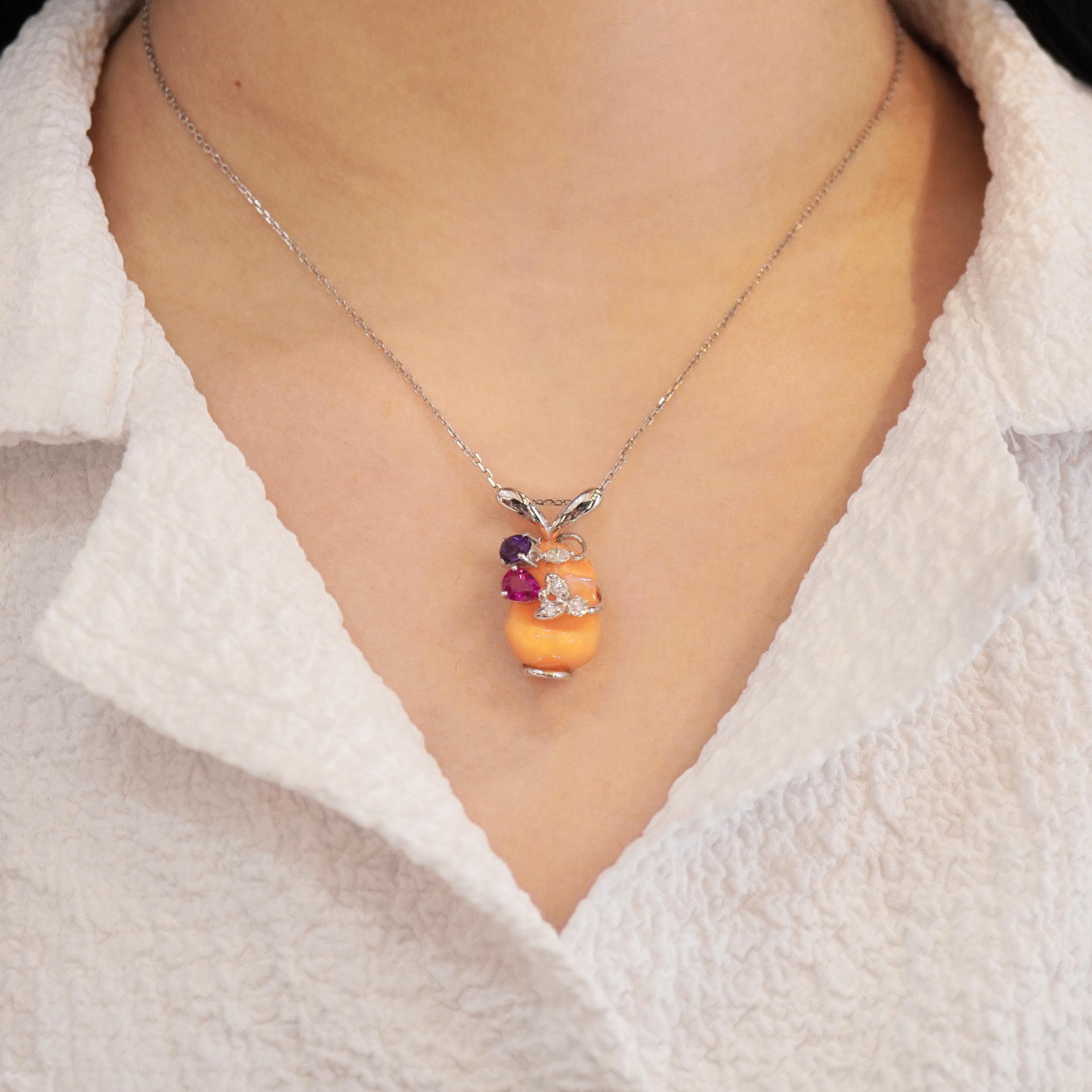 This vibrant Mexican fire opal pendant necklace showcases a glowing natural orange fire opal with a smooth cabochon finish that radiates warmth and brilliance. Accented with a vivid pink ruby, a rich purple amethyst, and sparkling white diamonds, the design creates a playful yet elegant composition of color and light. Unique and eye-catching, this fire opal gemstone pendant is perfect for collectors who appreciate rare gemstones and artistic jewelry design.