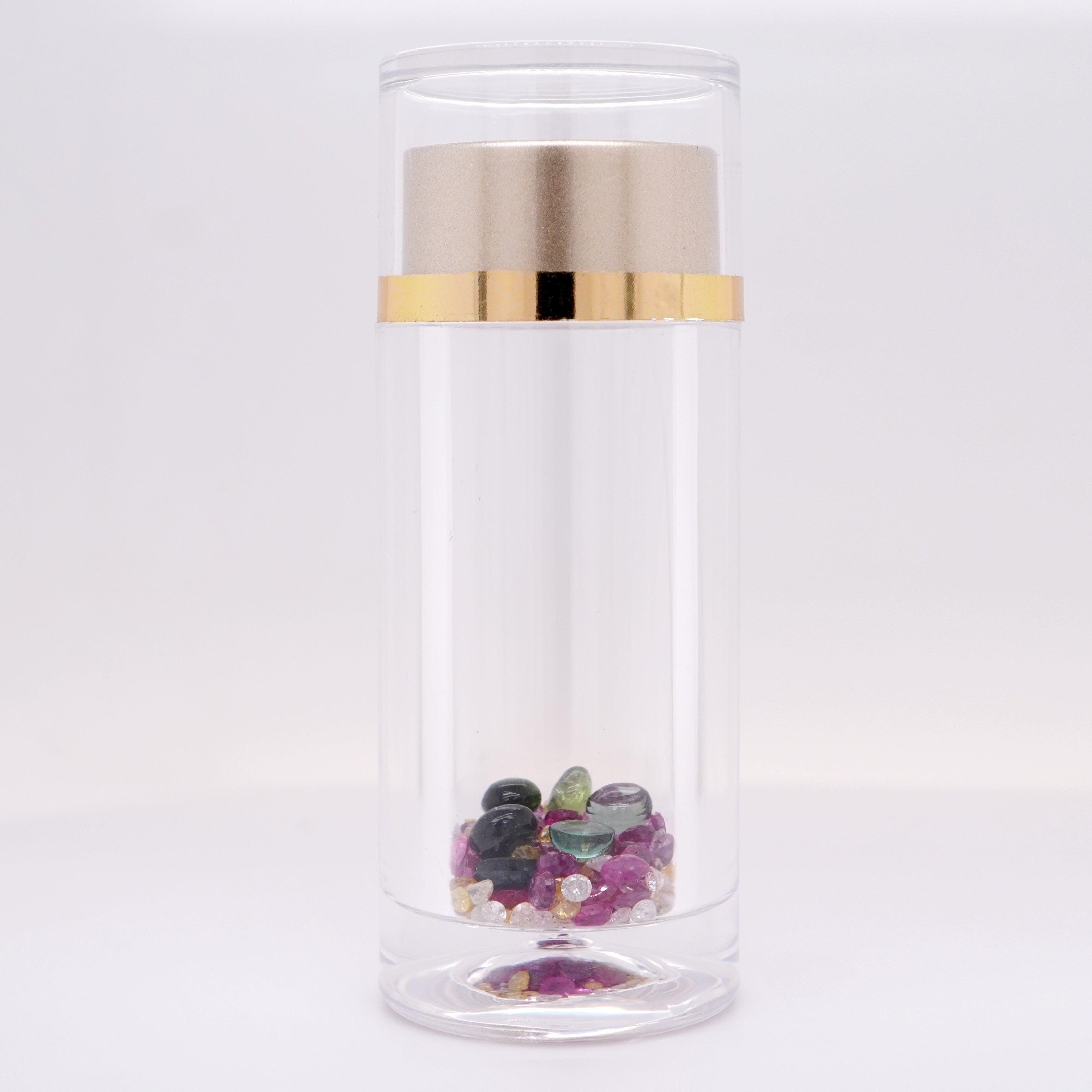 This Vault of Wonders bottle holds a vibrant symphony of natural gemstones — lush green tourmalines, playful pink sapphires, sunny yellow accents, and shimmering mixed hues that catch the light with every movement. Each stone has its own personality, its own story, its own future.