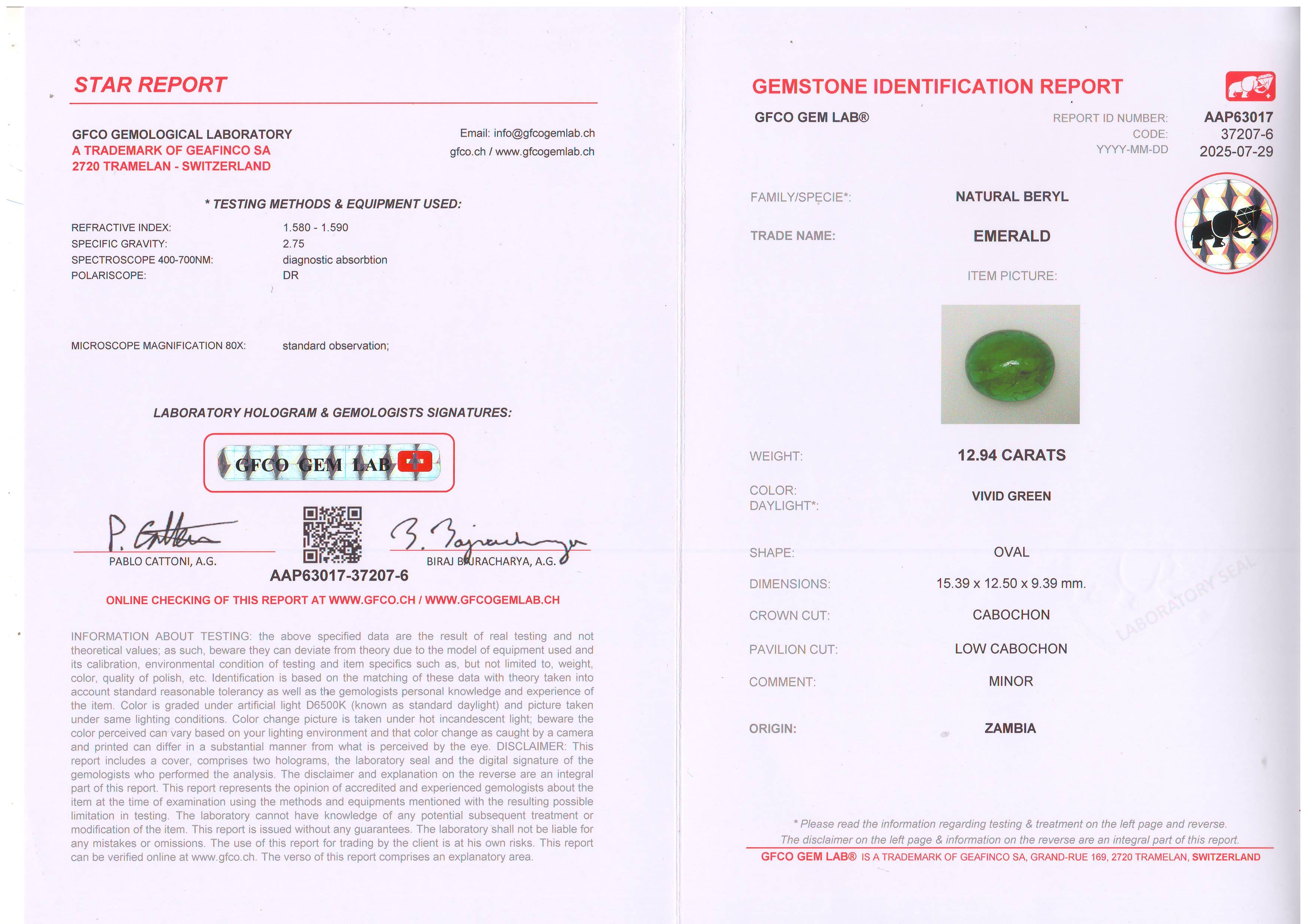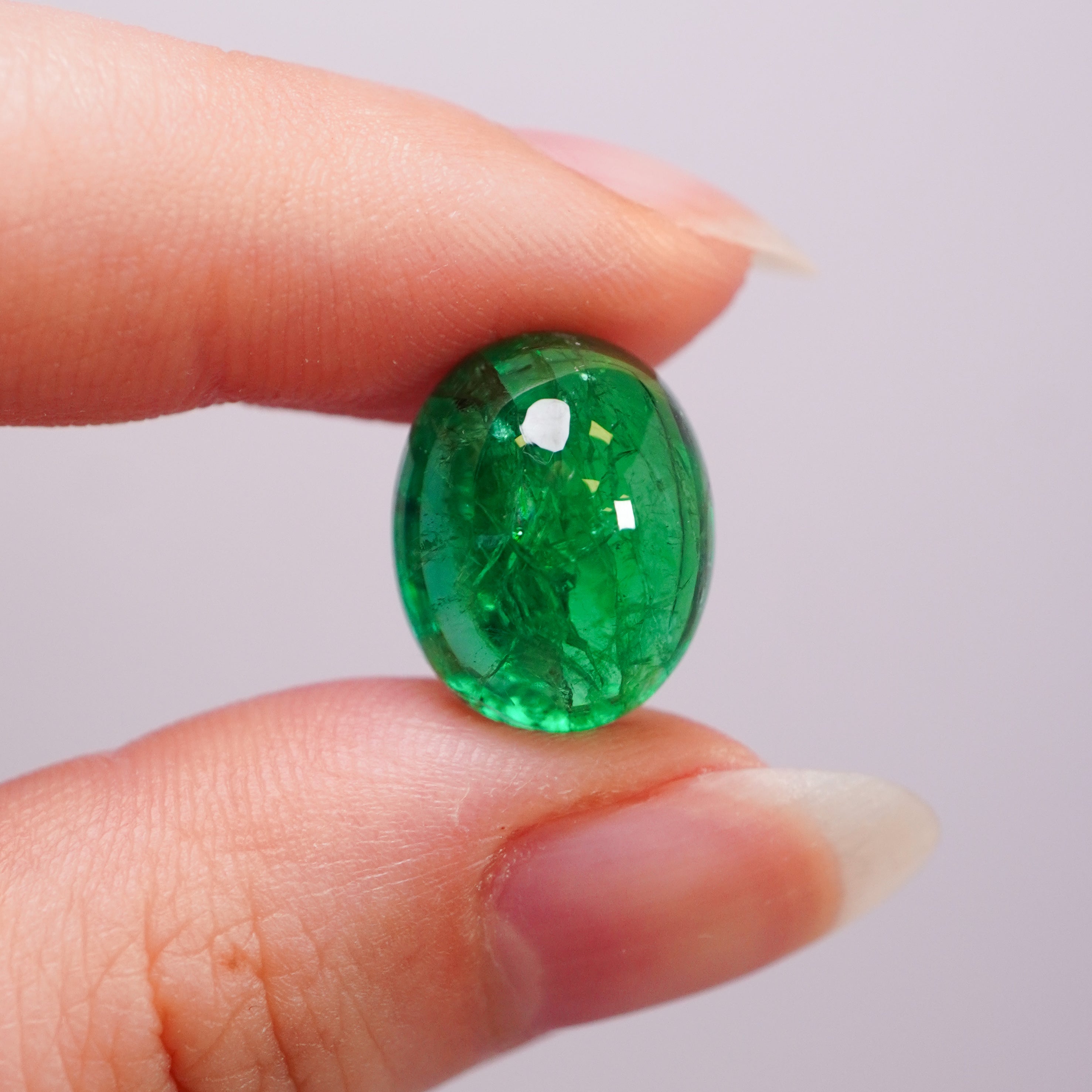 A 12.94-carat vivid green Zambian Emerald Cabochon with a rich, glowing hue and smooth dome polish that highlights its natural allure. Known for their deep saturation and durability, Zambian emeralds are treasured by collectors and designers alike — perfect for creating a statement ring, pendant, or adding a rare gem to your collection.