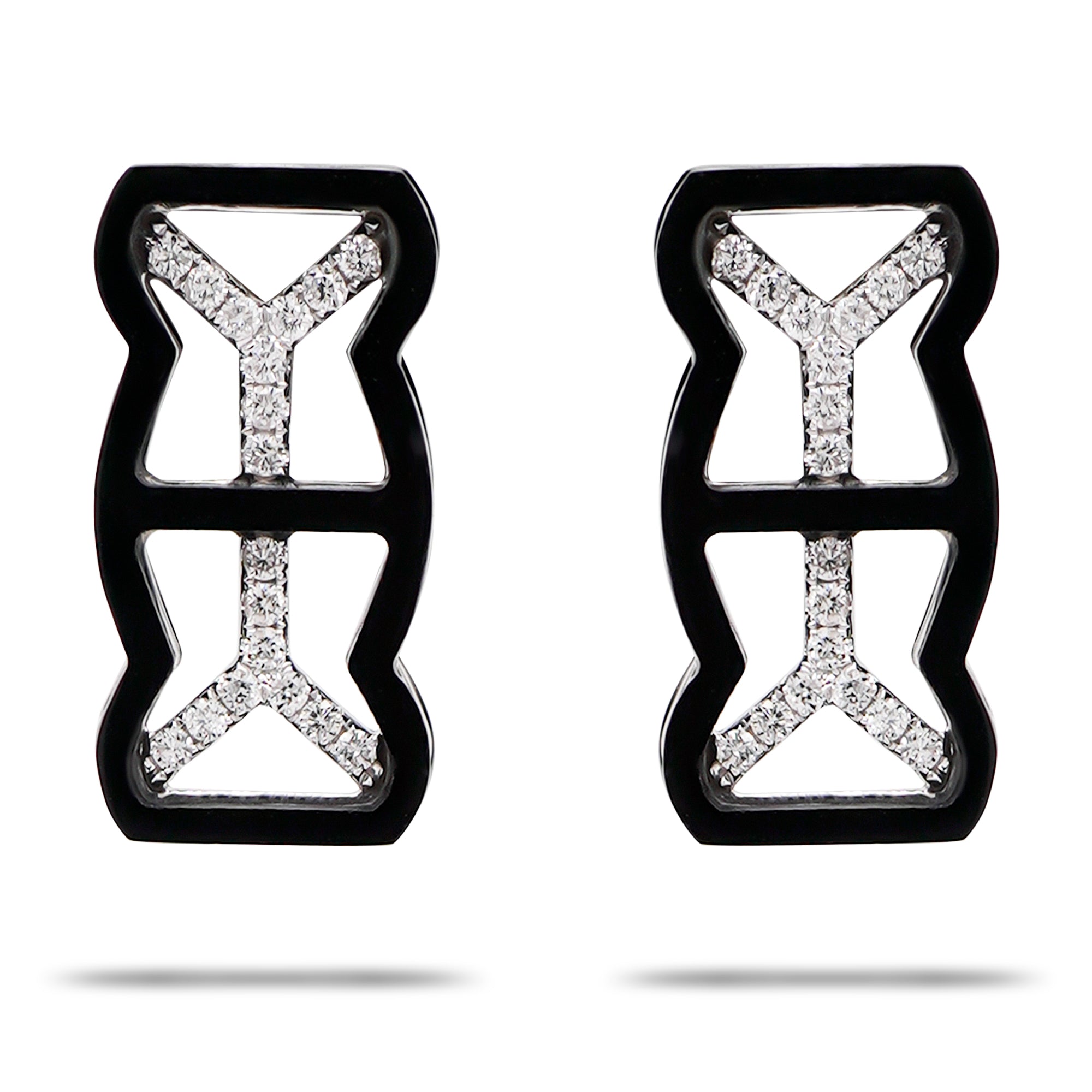 Bold, modern, and effortlessly chic—these 18K white gold earrings combine glossy black onyx with sparkling white diamonds in a striking geometric design. The contrast is eye-catching yet refined, giving you a statement piece that still feels timeless.